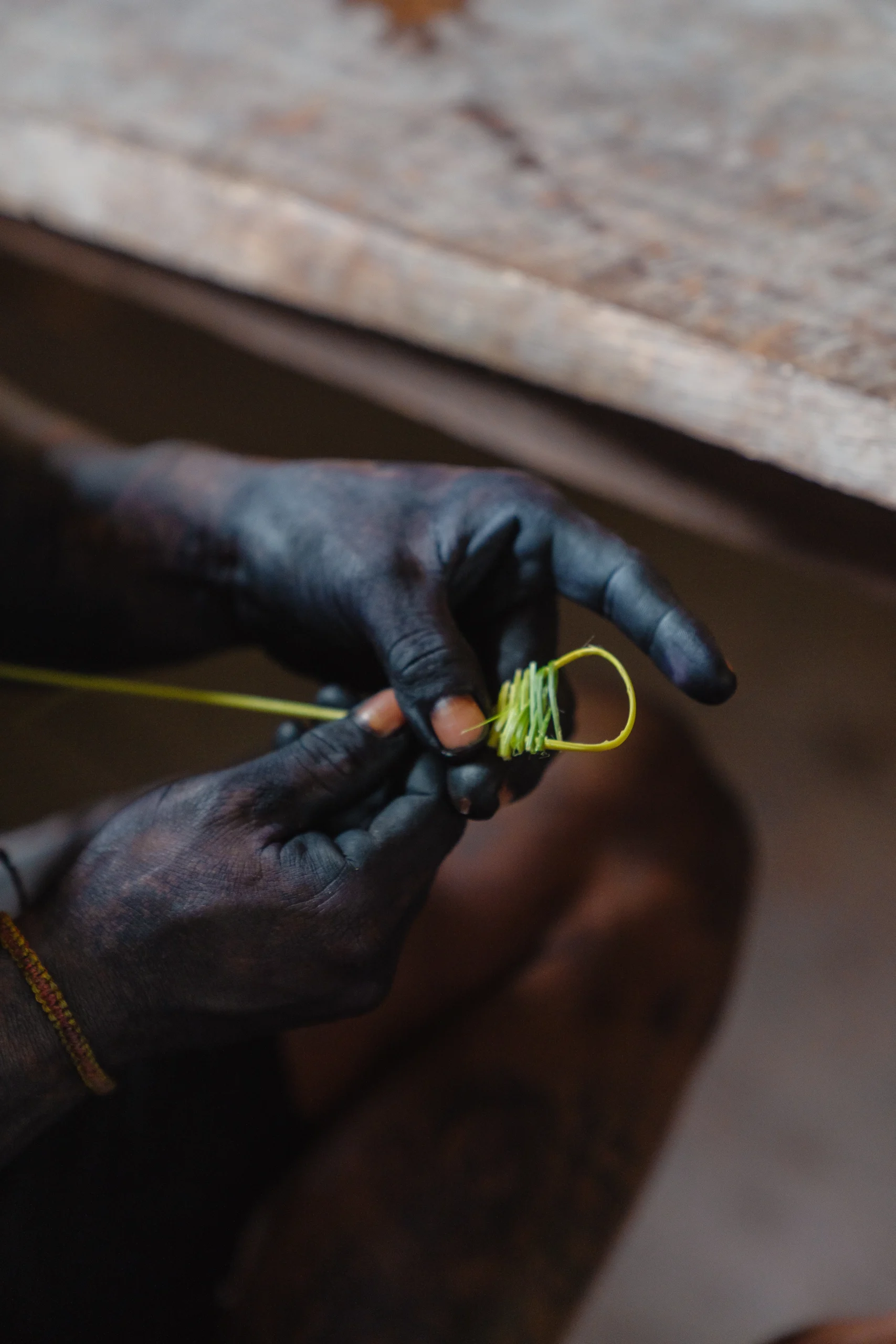 Its process involves harvesting in the forest, drying, hand-spinning, and dyeing with natural pigments obtained from plants, roots, fruits, and bark. This knowledge has been passed down from generation to generation by Waorani women, who have kept this practice alive as an expression of identity and relationship with the territory.