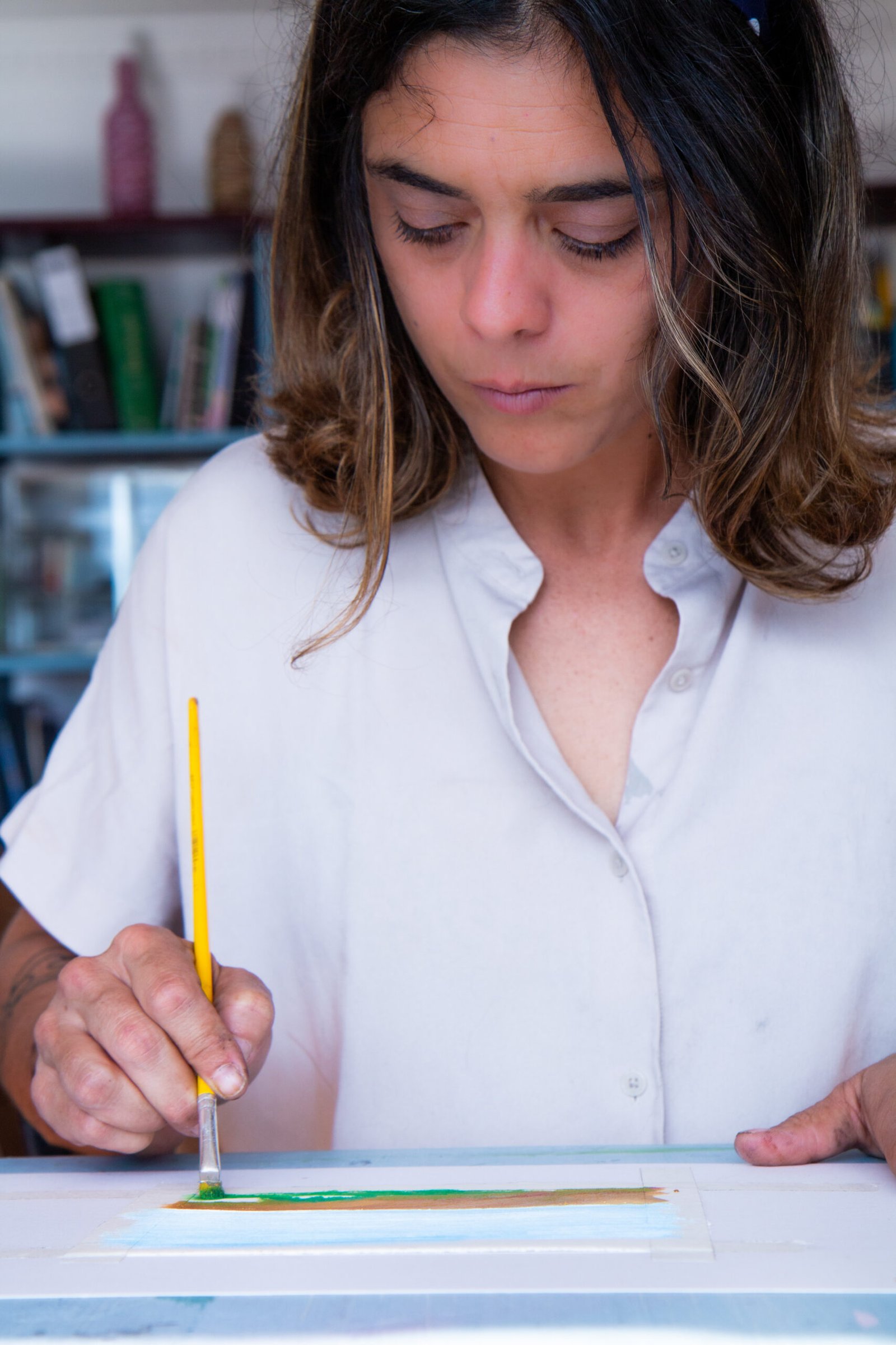 Painting represents one of her primary languages: a material practice that expresses an intuitive, cyclical, and grounded gesture, understood as a connection between memory, body, and territory. Her artistic research promotes symbiotic relationships between art, community, and nature, fostering ancestral knowledge and its continuity for future generations.